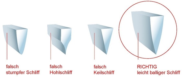 - Beim Nachschleifen darauf achten, dass nach dem Vorschliff die Oberfläche mit einem sehr feinen Schleifband oder mit einer Filzscheibe wieder verfeinert wird.